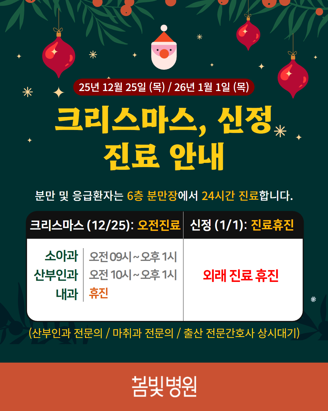 2025년 12월 25일(성탄절), 2026년 1월 1일 신정 진료안내